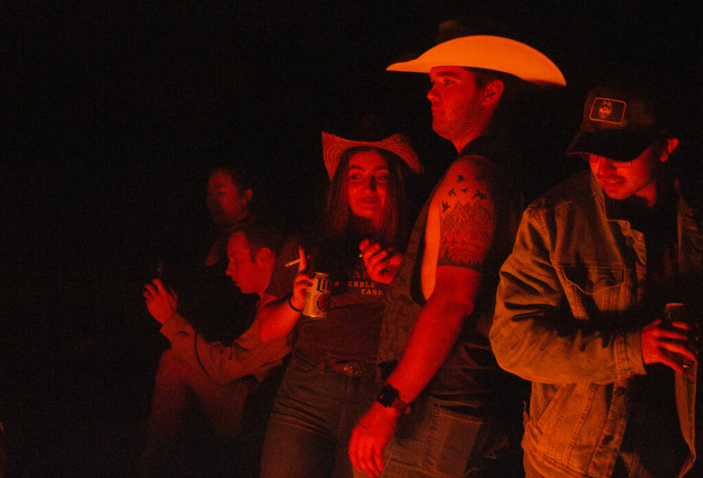 A group of stu­dents look upon a fire at a cow­boys and hip­pies par­ty pre­sent­ed by the fra­ter­ni­ty Alpha Gam­ma Rho on Oct. 12, 2024 in Storrs, Con­necti­cut. Pho­to by Eri­ka Avel­li­no ’26