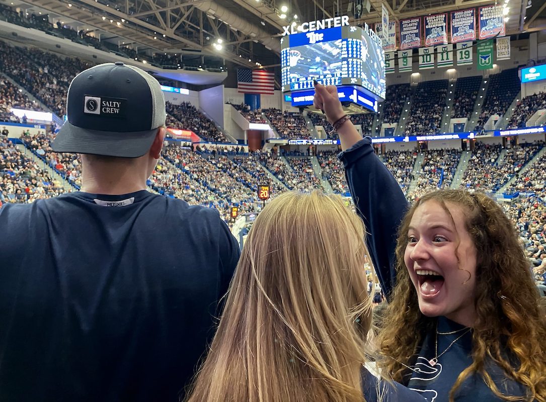 UConn Junior Riley Cigal celebrates with friends during a timeout at the UConn Men’s Basketball game at the XL Center in Hartford, Conn., Tuesday, Feb. 22, 2022. Photo by John Leahy ’23