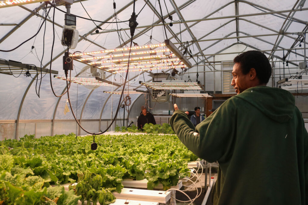 Michael Martins walks along one of the hydroponic greenhouses that is growing lettuce under LED lights on Nov. 10, 2025 at Meechooôk Farms.