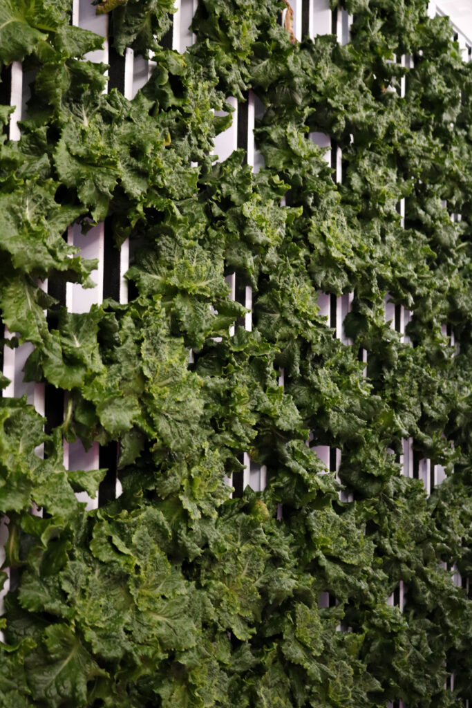 Shi explained that the lettuce typically takes 4–6 weeks to grow and then they will harvest an entire wall which takes around 3–3/1/2 hours.