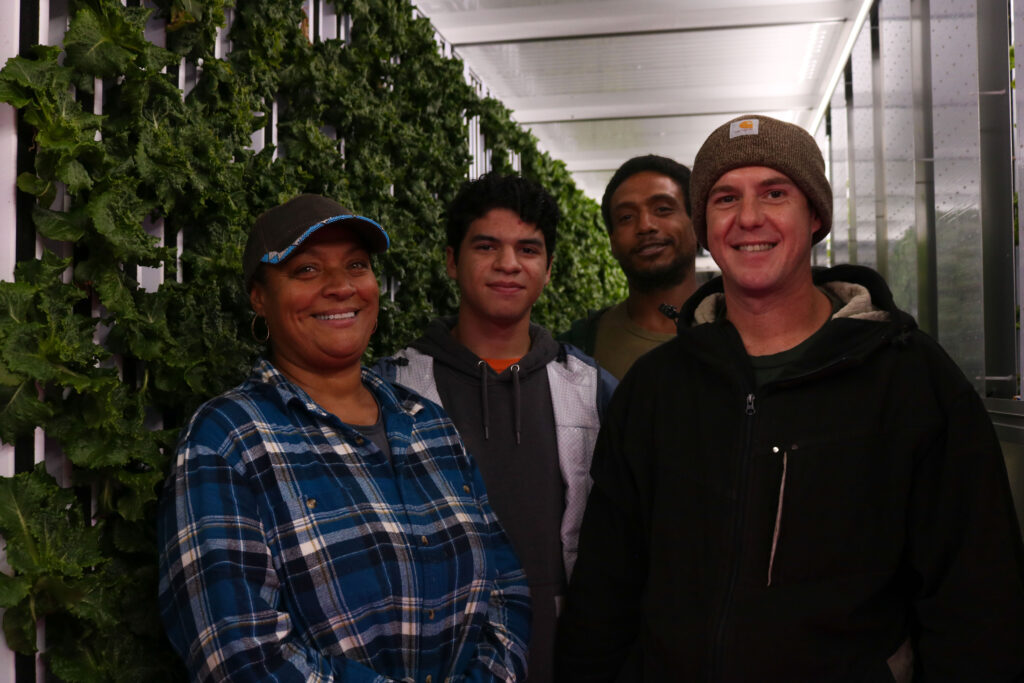 Pictured from left to right, Shi Spears, Emaneul Duran, Michael Martins and Bryan Holder stand in front of the walls of lettuce of the freight farms on Nov. 10, 2025 at Meechooôk Farms.