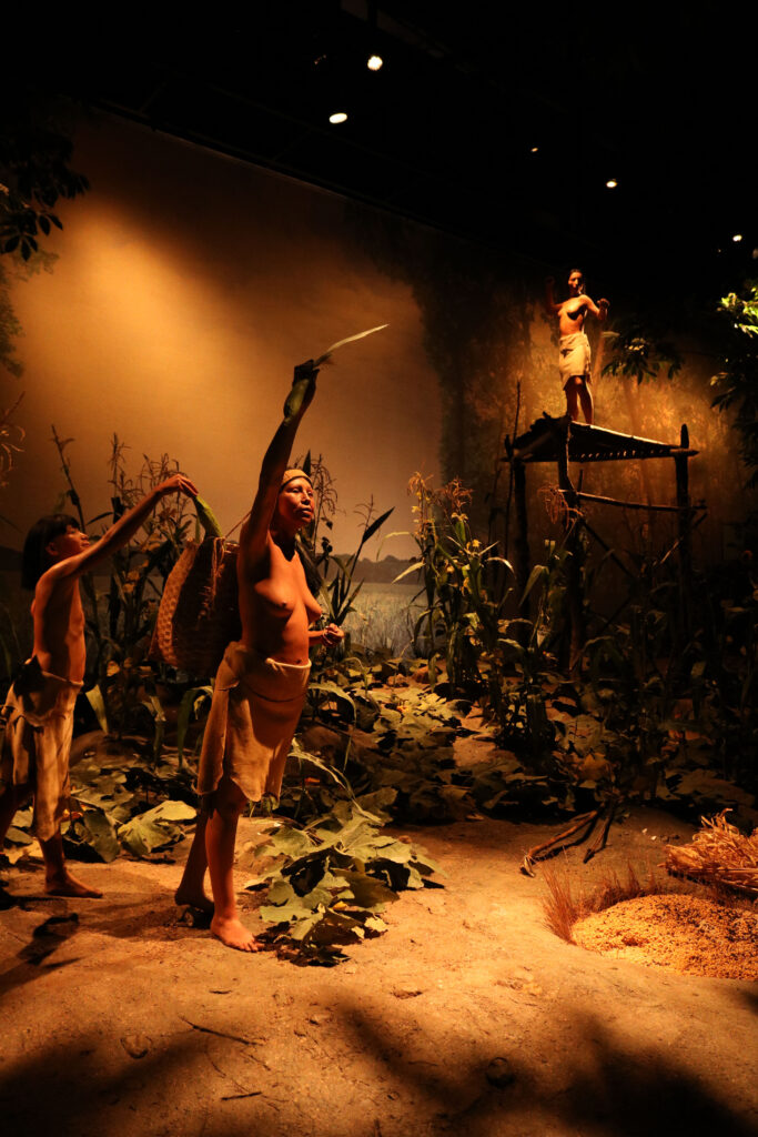 Displays showing artifacts and scenes that capture moments in Indigenous history have helped Northeastern Native communities reclaim their history by correcting myths often assumed about Indigenous peoples. In one display, villagers collect corn, which was a central part of native agriculture.