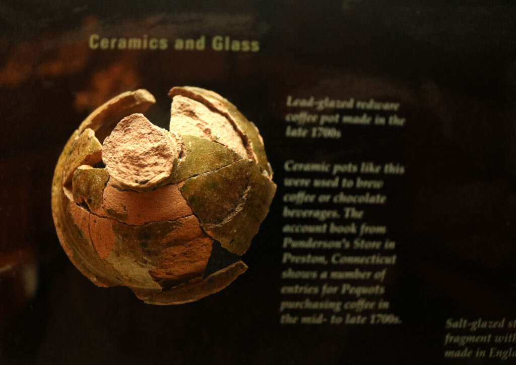 A reconstructed ceramic coffee pot made in the 1700s and recovered from an archaeological site in Preston, Connecticut is on display in the Mashentuquet Pequot Museum. Pots like this were used to brew coffee or chocolate, showing a glimpse into native life during the time.