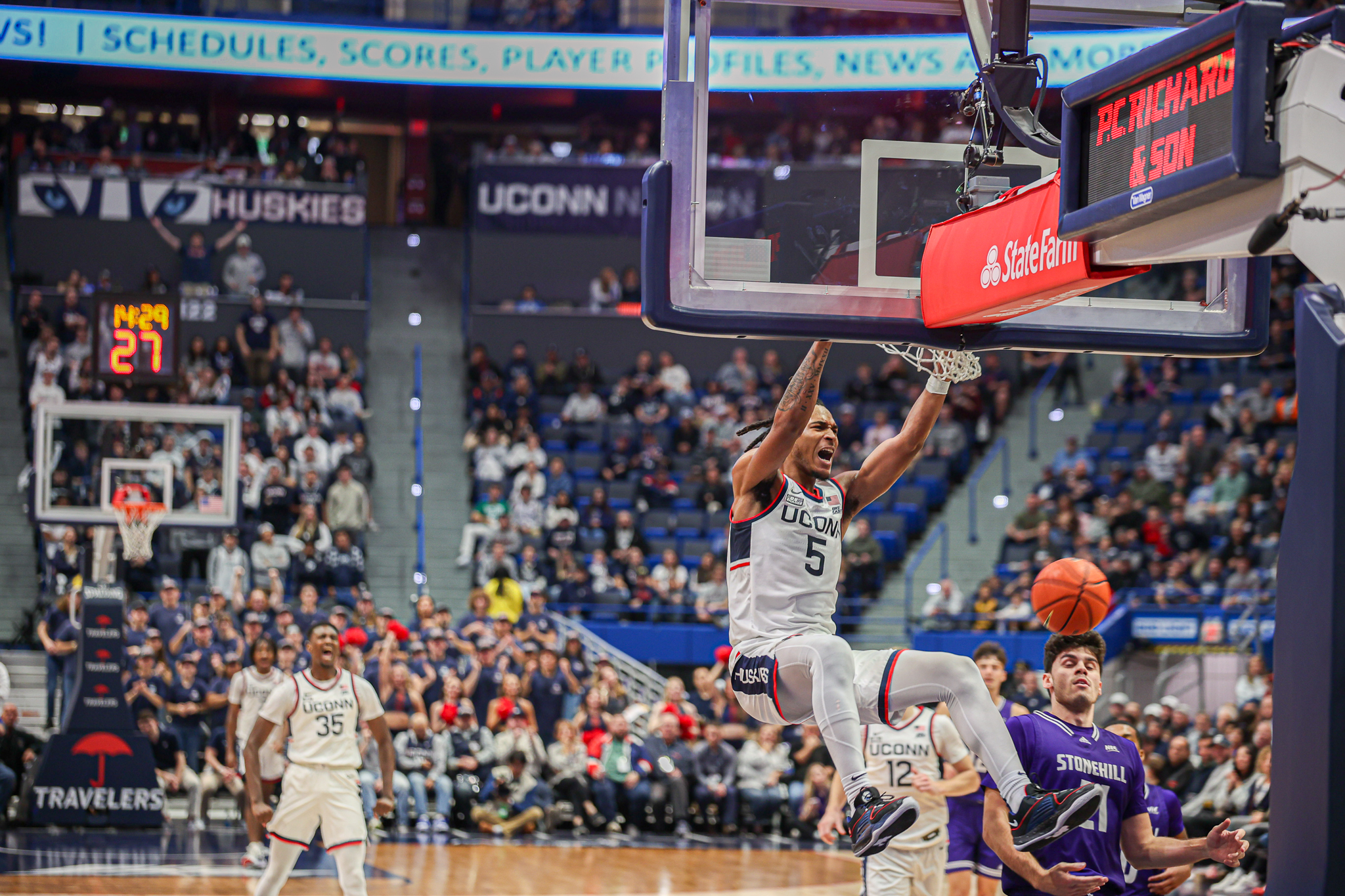 UConn Men’s Basketball guard Stephon Castle (5) throws down a fastbreak dunk against Stonehill College at the XL Center in Hartford, Connecticut on November 11, 2023. Photo by Evan Rodriguez ’24