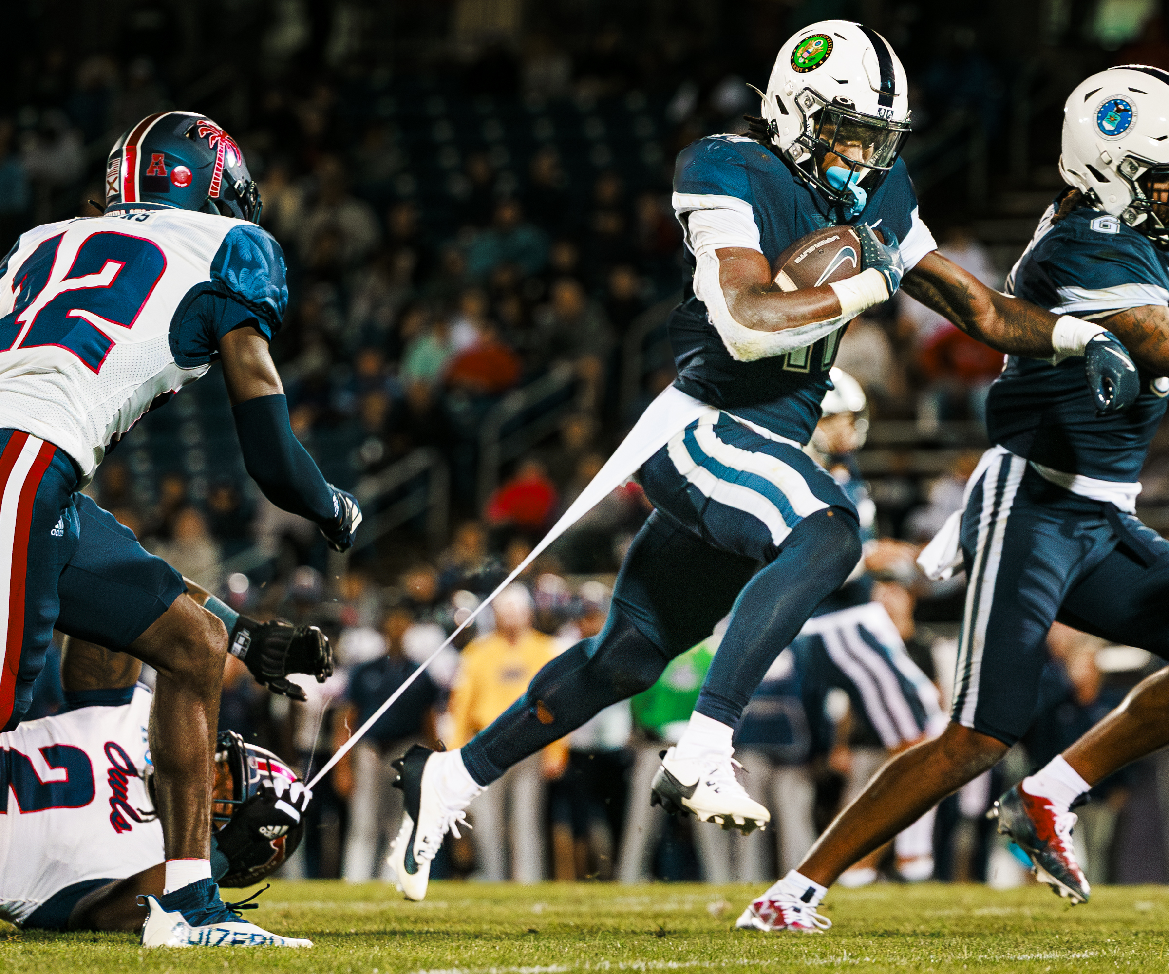 UConn Journalism major Kaleb Jennings captured this moment during the UConn-Florida Atlantic University football game at Pratt & Whitney Stadium in East Hartford, Conn., on Sept. 21, 2024. UConn running back Durell Robinson stretches for the touchdown as FAU defensive end Wilky Denaud tries to pull him down by his jersey. UConn defeated FAU, 48–14.